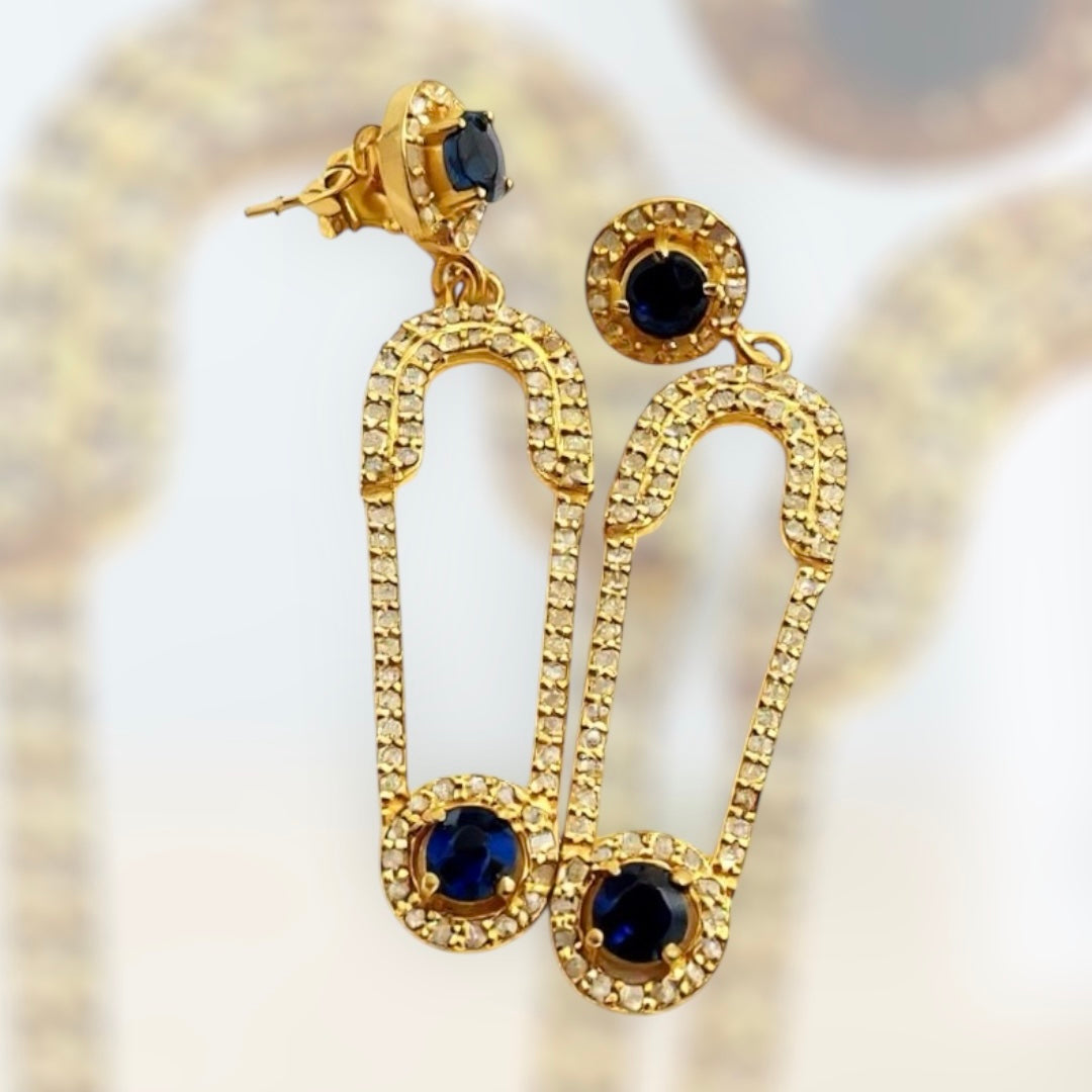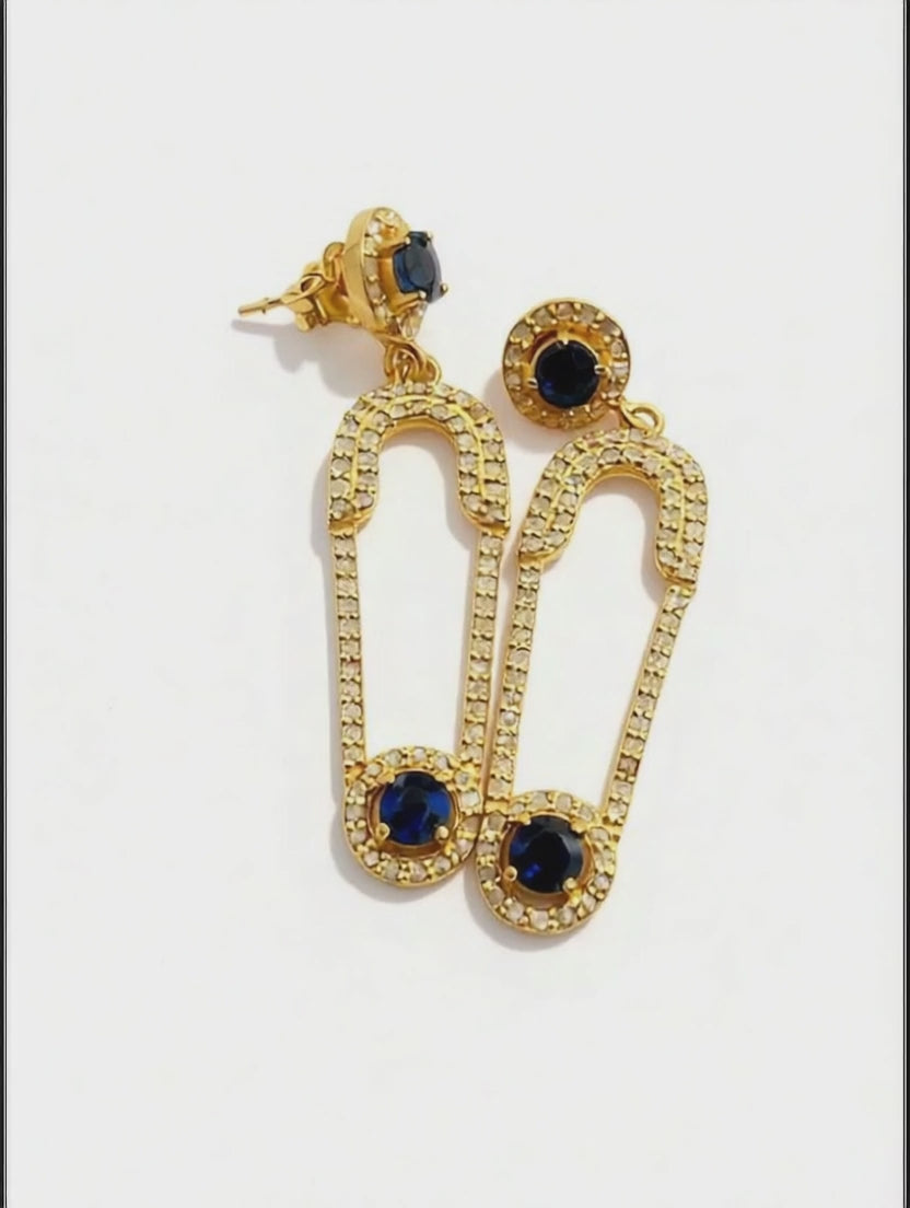 SILVER DIAMOND SAPPHIRE SAFETY PIN EARRINGS